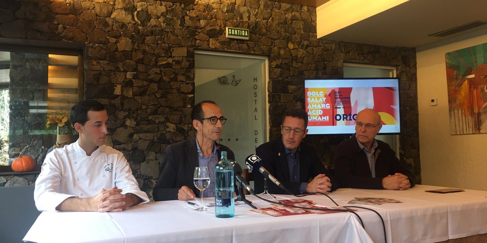 El programa d’Orígens 2019 s’ha donat a conèixer aquest matí a l’Hostal dels Ossos, a Batet de Serra (Olot). La presentació ha anat a càrrec del regidor de Promoció de la Ciutat, Estanis Vayreda; Pep Palau, director de l’empresa Pep Palau, von Arend & Associats -empresa organitzadora d’Orígens-; David Coloma, de l’Associació d’Hostalatge de la Garrotxa i Joan Massegur, cuiner del Restaurant Hostal del Ossos i membre del col·lectiu.